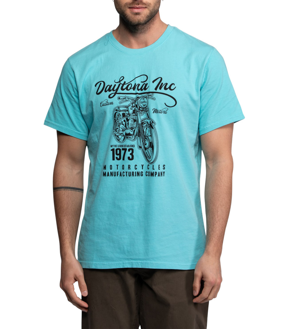Ce tee-shirt coupe droite Daytona en coton bleu ciel capture un esprit vintage irrésistible grâce à son grand imprimé noir sur le devant. L'illustration évoque l'univers des motos avec le nom "Daytona Inc", une silhouette de moto et des détails comme l'année 1973 et la mention "Motorcycles Manufacturing Company", pour un look rétro et dynamique qui respire la liberté sur route.